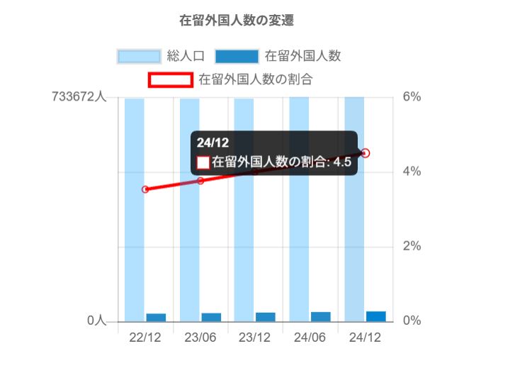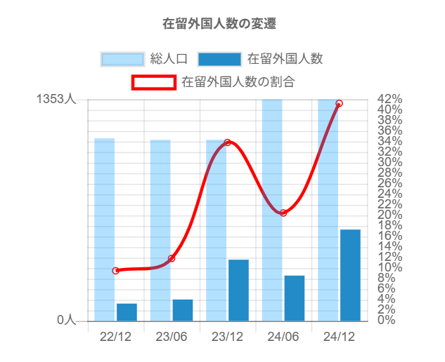 According to the December 2024 statistics on foreign residents, the number of foreign residents was 558, accounting for just over 40% of the total population, and the rate of change from the previous year was an impressive 7.4 points higher.