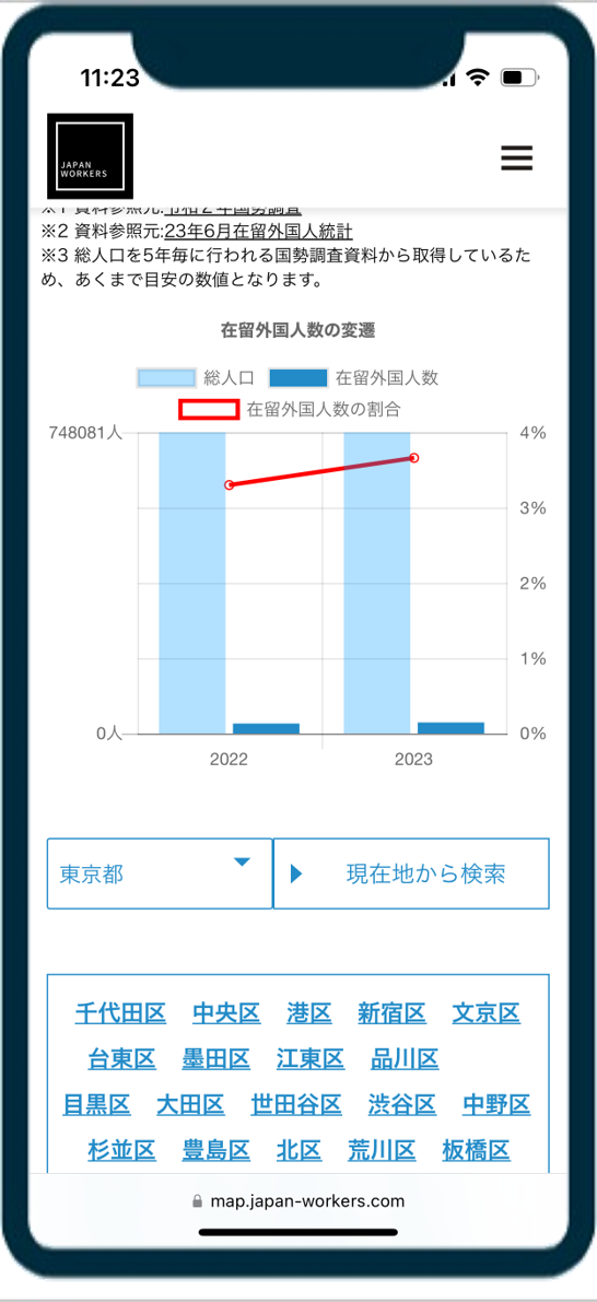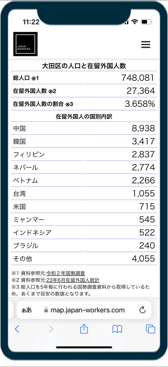 ![]() | The number of foreign residents by municipality is now displayed on the page. For example, take Ota Ward, Tokyo, as shown on the left. The total population is around 750,000, and the number of foreign residents around 27,000. The ratio of foreign residents to the total population is 3.65%, or about 4 out of 100 people are foreigners. |